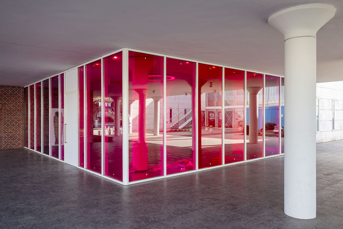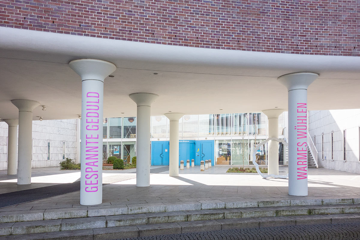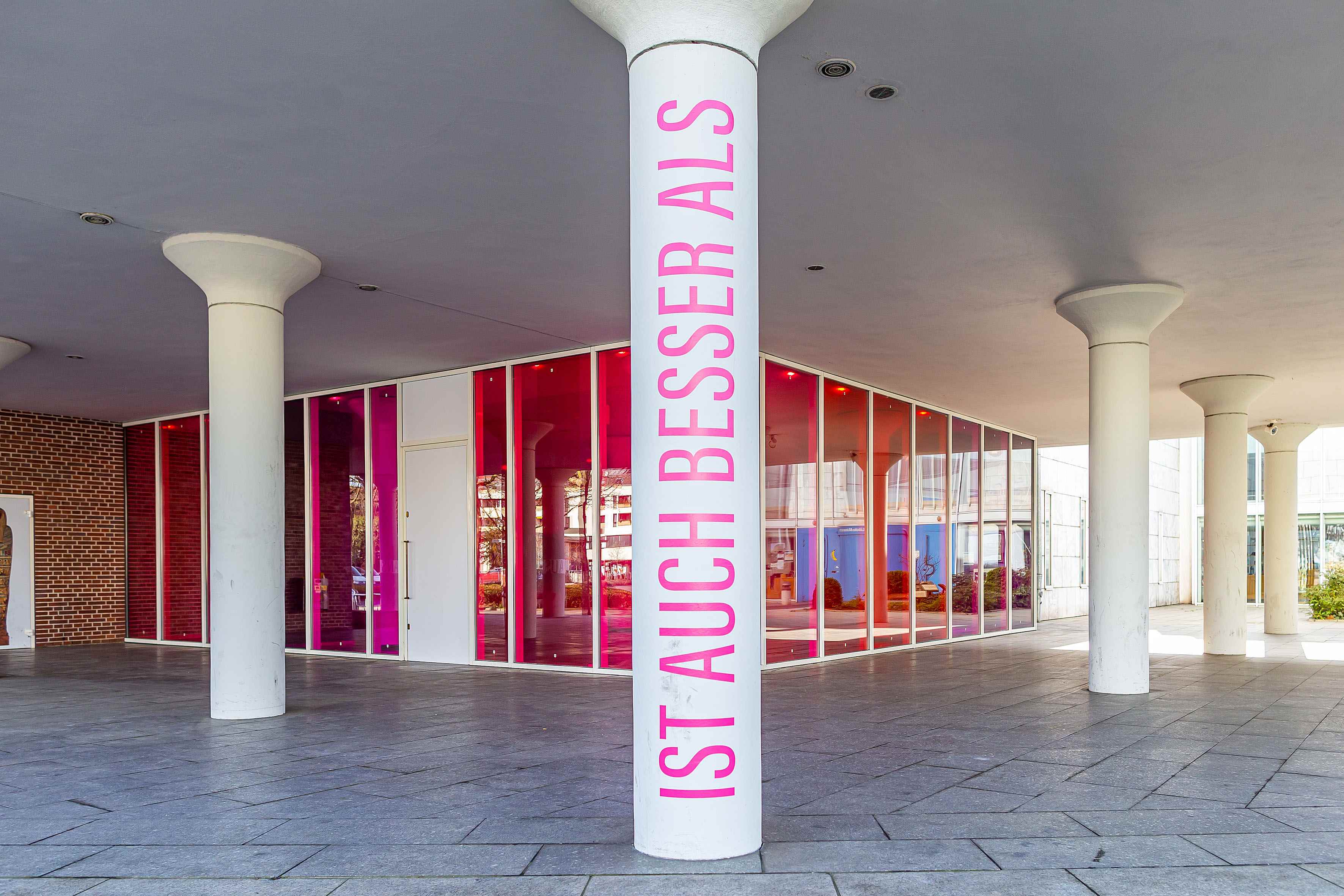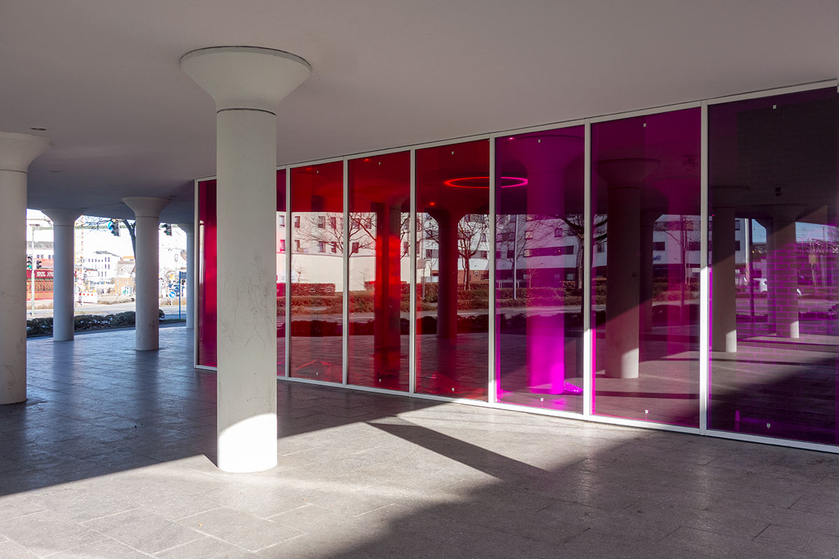 Auf der strengen Glasfassade liegen monochrome Folien in Rot, Pink und Violett, und der Fußboden ist mit silbriger unebener Noppenfolie ausgelegt. Sobald die Betrachtung durch die weitläufige Fensterfront erfolgt, erscheint auch der ausladende Museumshof und das quirlig urbane Leben wie in ein farbiges diffuses Licht getaucht. Der ansonsten strenge Raum, in dem man sich zwischen Sein und Schein bewegt, gewinnt an Leichtigkeit, Flüchtigkeit und Tiefenräumlichkeit. Die während des coronabedingten Lockdowns entstandene Ausstellung HOFFENT_LICHT spiegelt nur zu gut die gesellschaftlichen Verhältnisse unserer Zeit, in der die Grenzen zwischen der virtuellen und der realen Welt kaum noch existieren.