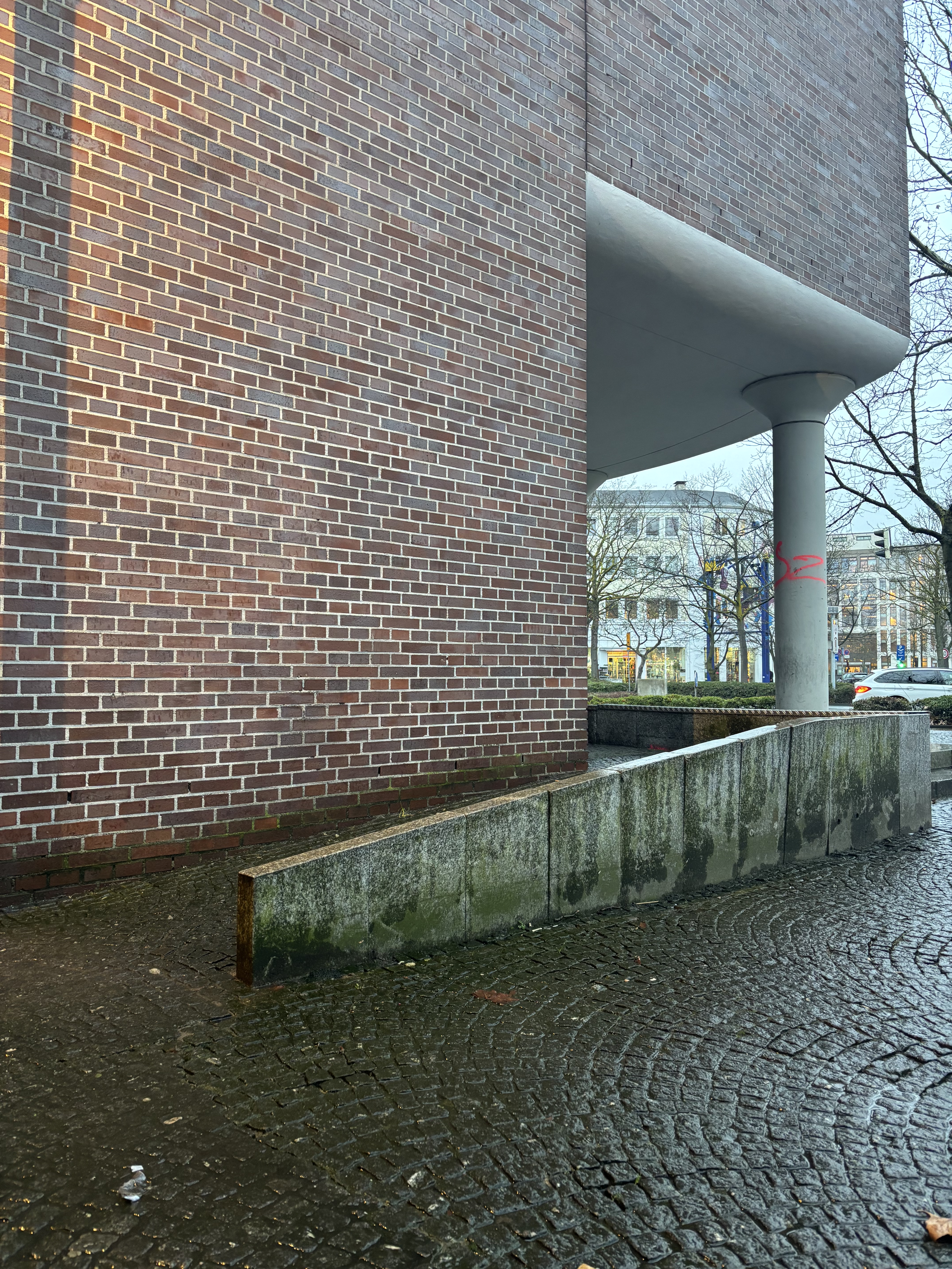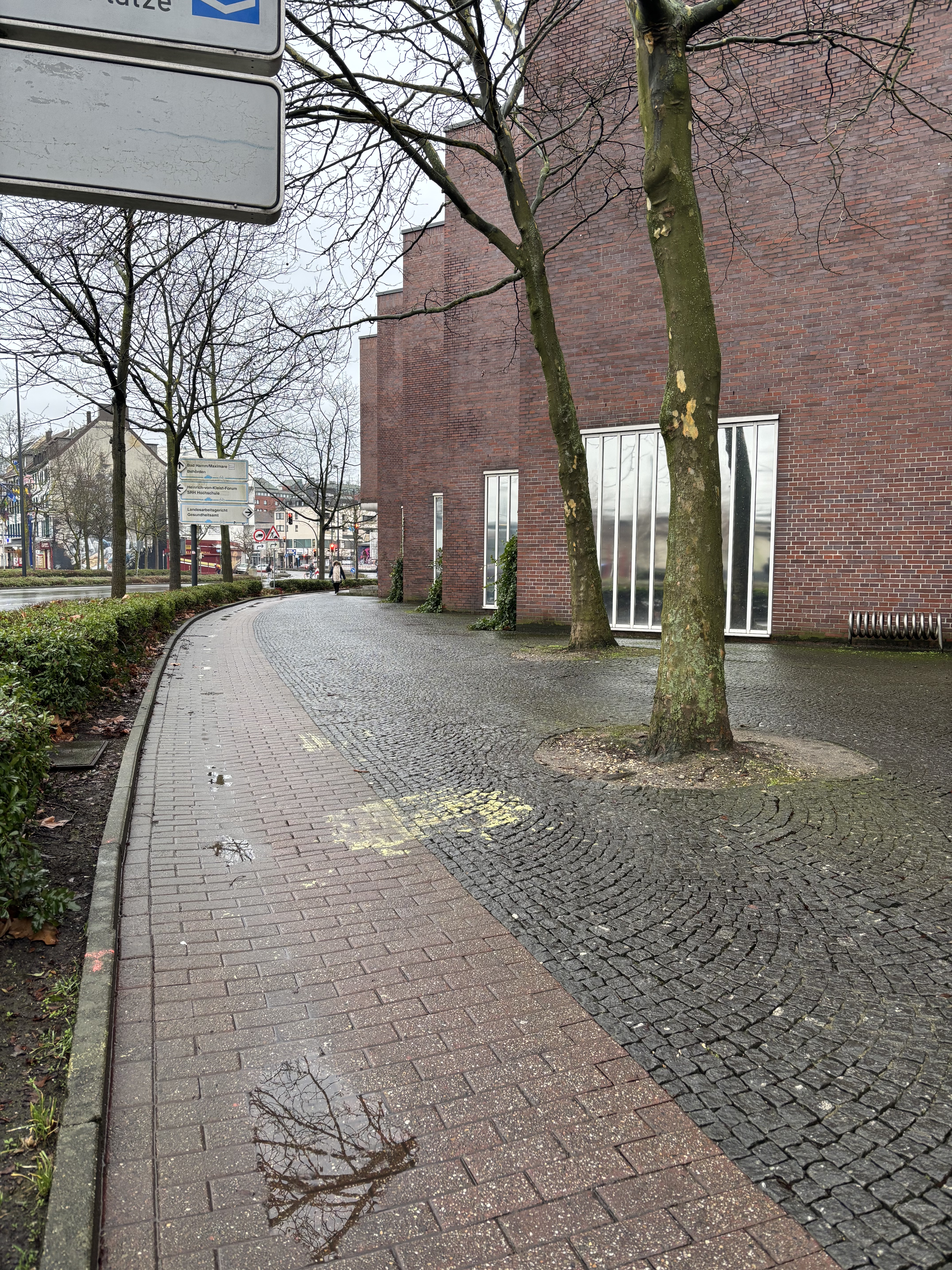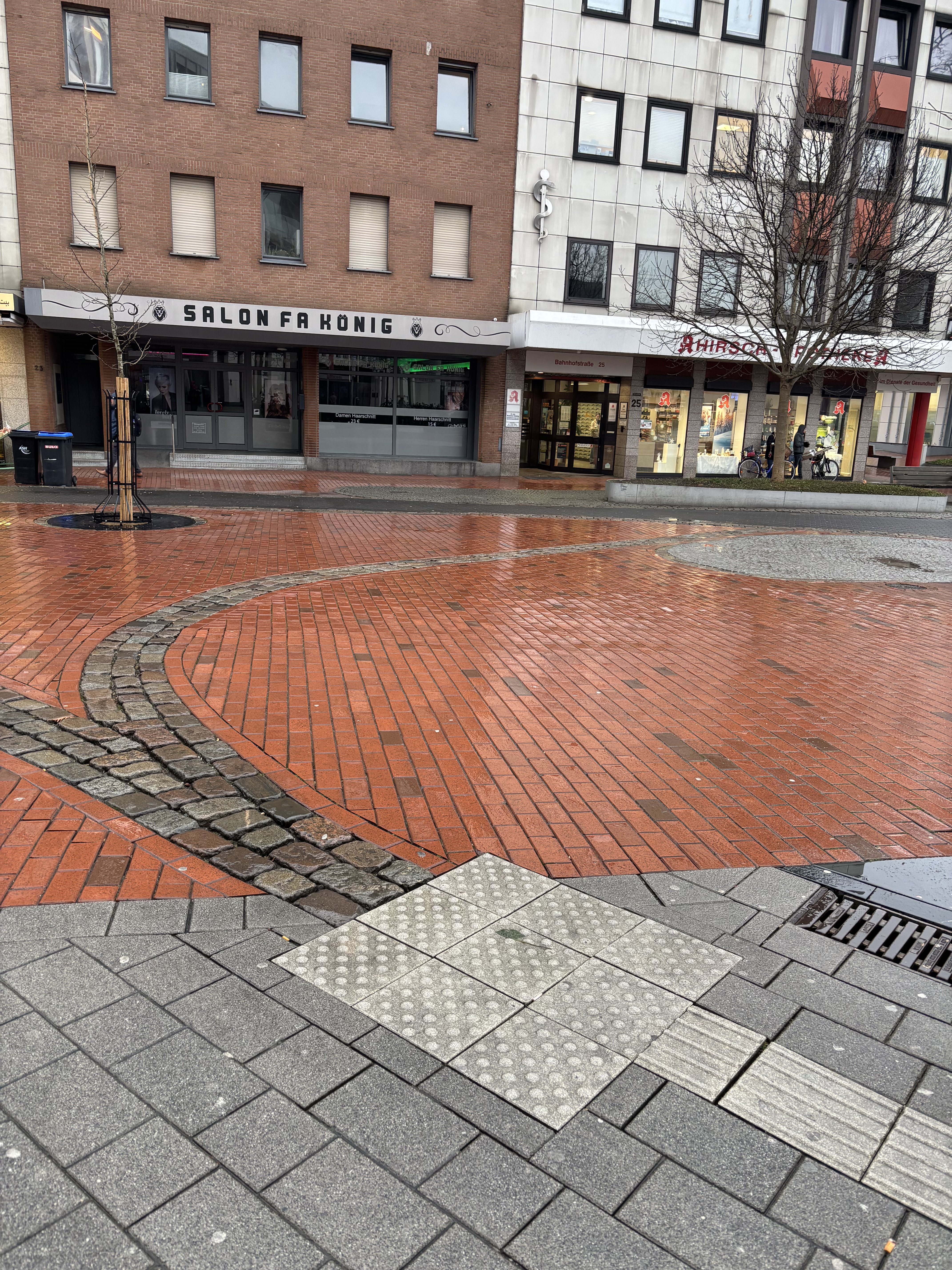 Sie befinden sich nun auf dem Vorplatz des Heinrich-von-Kleist-Forums. Folgen Sie dem Leitstreifen über den Bibliotheksplatz bis zum Ende und halten Sie sich dann am Kopfsteinpflaster rechts.