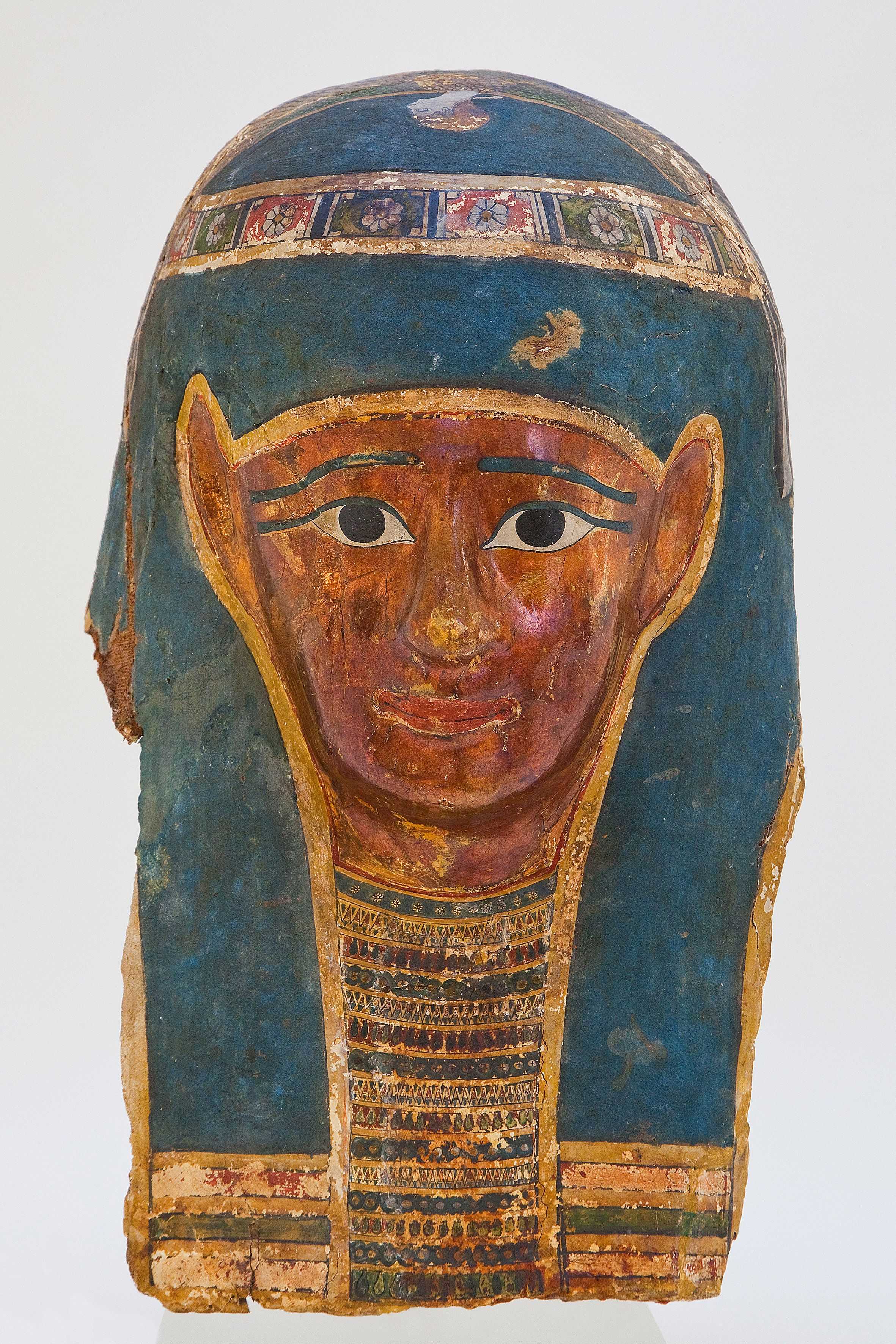 Mumienmaske, Frühe Ptolemäerzeit, ca. 300–250 v. Chr., Ägypten, Achmim (?) Kartonage, stuckiert, bemalt, vergoldet 39,0 × 24,5 × 32,0 cm, © Gustav-Lübcke-Museum Hamm/Thorsten Hübner
