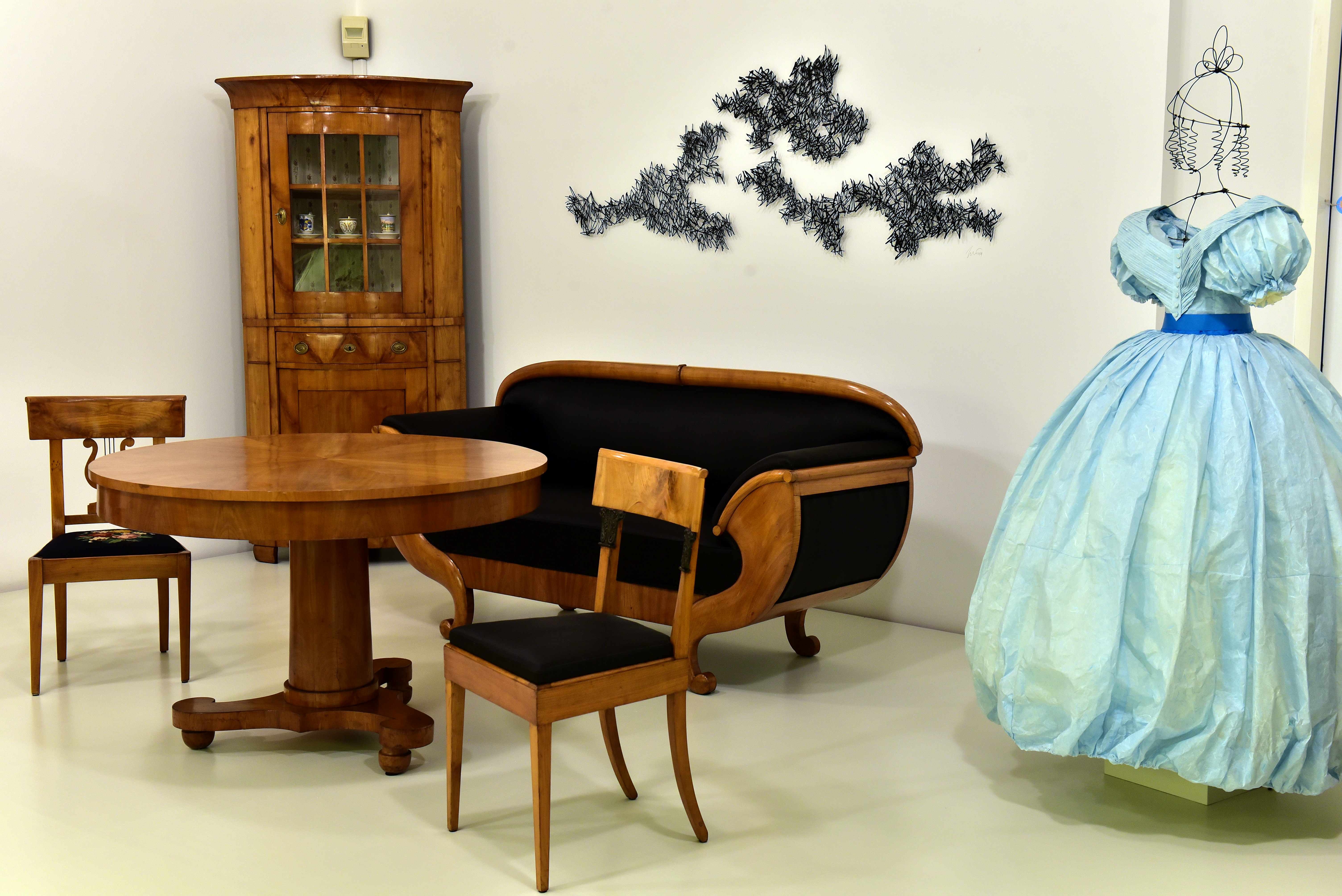 Ensemble Biedermeier mit aktuellen Interventionen von Ludmilla Ogneva: Papierkleid „Luise“, 2014; Jessica Toliver: Papierschnitt Mezzo, 2019, © Gustav-Lübcke-Museum Hamm