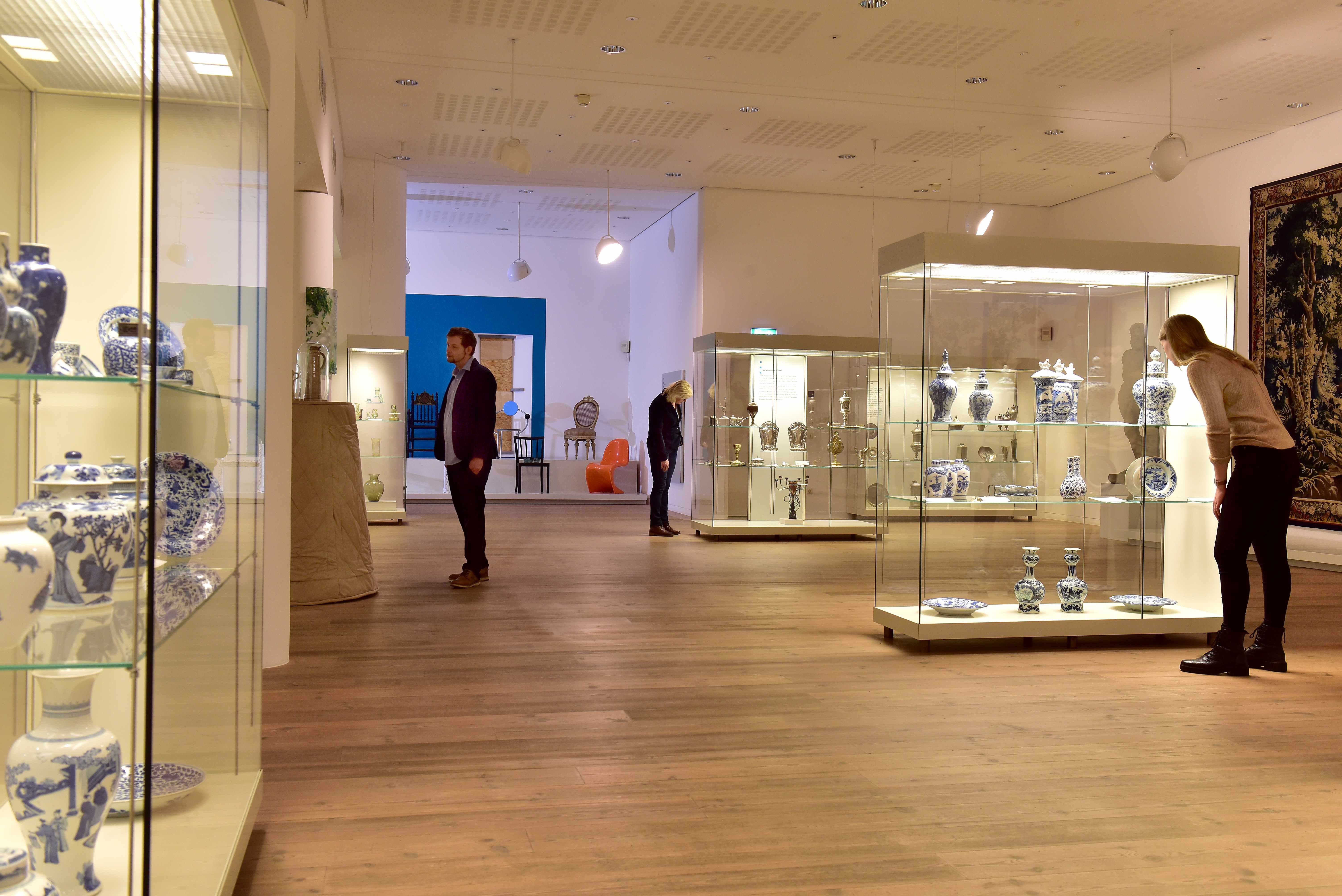 Im Weiteren konzentriert sich die Präsentation auf die Materialwelten der angewandten Kunst. Porzellane, Keramiken sowie Objekte aus Gold, Silber, Messing, Zinn und Glas aus unterschiedlichen Epochen öffnen den Blick für die ästhetische Variationsbreite und für den stilistischen und funktionellen Wandel, dem die Artefakte im Laufe der Jahrhunderte unterworfen waren. In einem Bereich trifft man auf eine doppelreihige Parade mit Stühlen aus der Zeit des Rokoko bis ins 20. Jahrhundert, darunter Stuhlklassiker internationaler Designer. Gegenüber den ausgestellten Stuhlreihen werden die Betrachtenden zum Sitzen eingeladen, zu einem gedanklichen Schwelgen durch die Stuhlgeschichte. Die gezeigten Varianten machen deutlich, wie facettenreich sich das heute selbstverständliche Sitzmöbel zeigt.