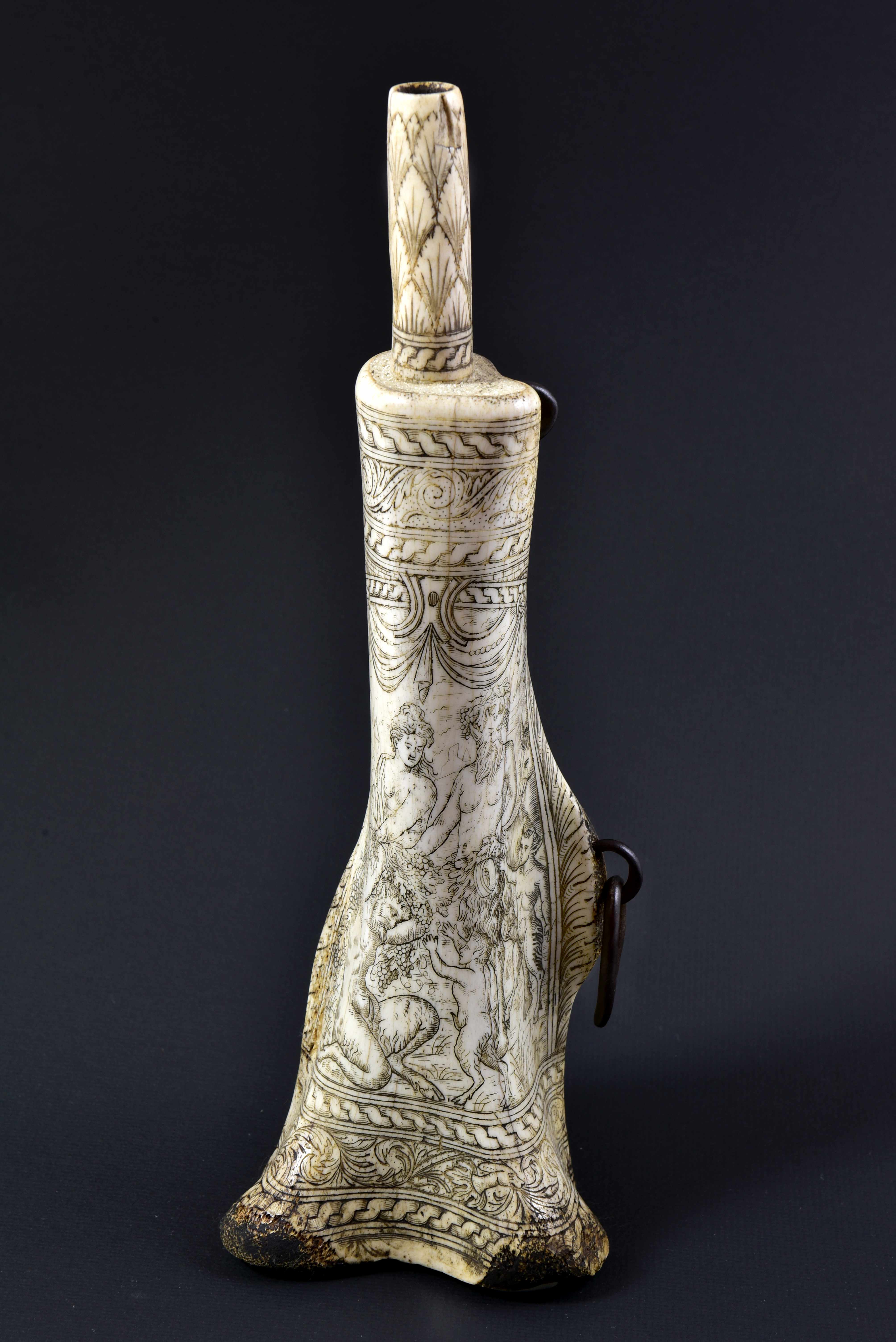 Pulverhorn mit Satyrn, vermutlich 19. Jh., Rinderhorn, graviert und geschwärzt, Eisen Höhe: 33 cm, © Gustav-Lübcke-Museum Hamm