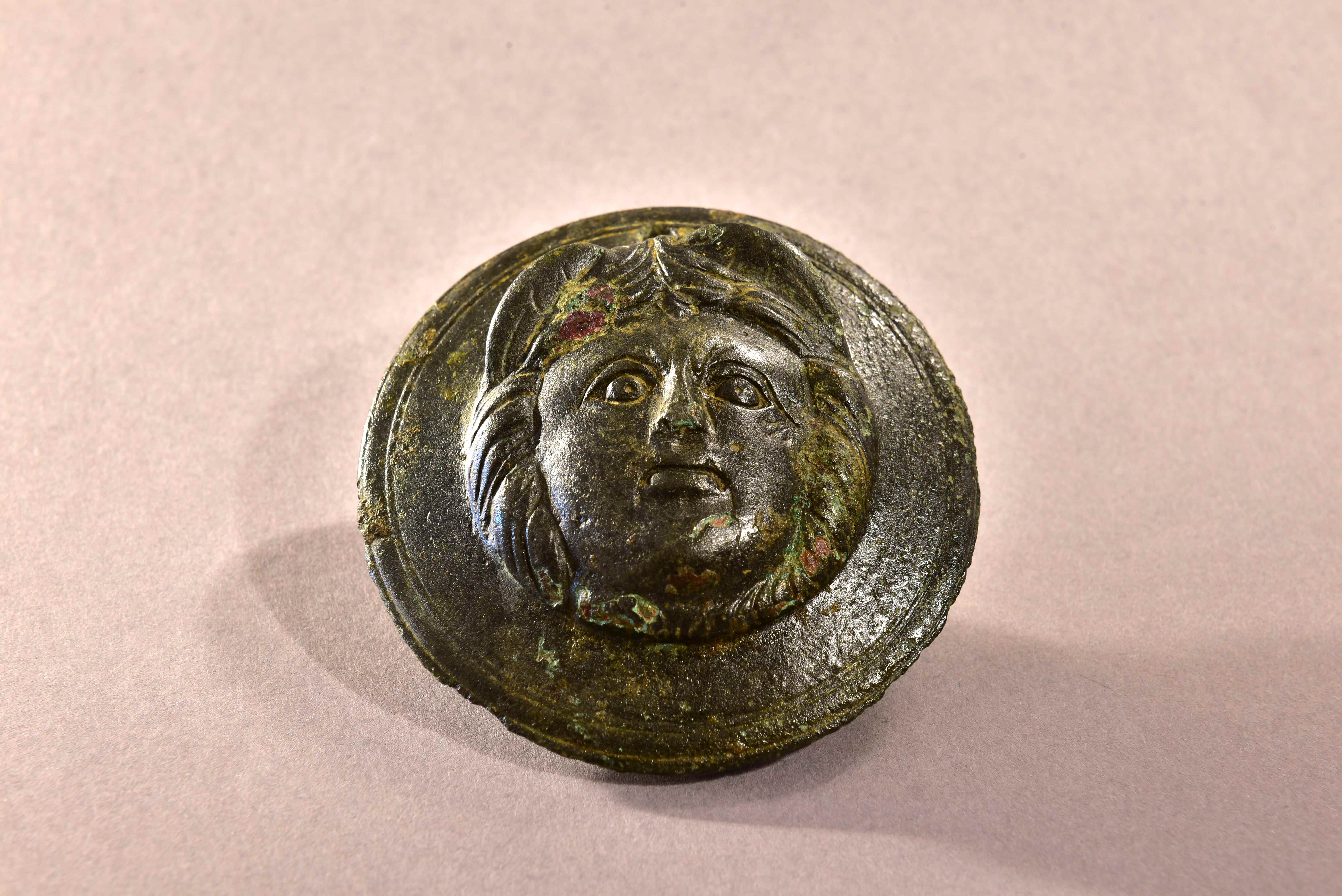 Phalera mit Darstellung einer Medusa, Bronze RKZ, Fundort: Kamen – Westick, Kreis Unna, D: 6,2cm, Inv.Inr. 10229, © Gustav-Lübcke-Museum Hamm