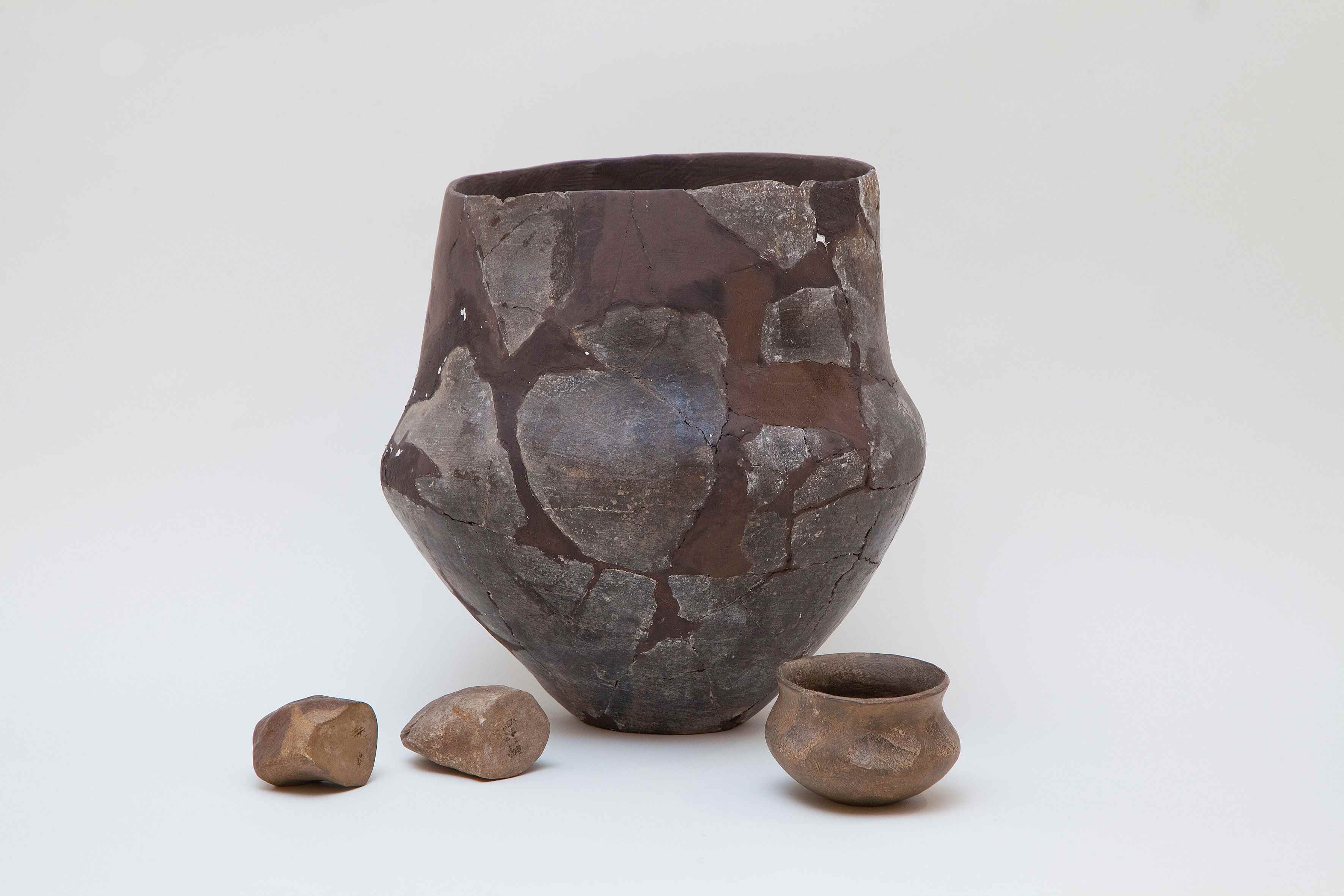 Grabinventar eines Handwerkers, Randlose Zylinderhalsurne mit Beigefäß und zwei Schleifsteinen Keramik, Sandstein, Bronzezeit, Fundort: Hamm, Zeche Radbod, Urne: H: 36,2cm, Inv. Nr. 4223, 4224, 4225, 4226, © Thorsten Hübner, Stadt Hamm