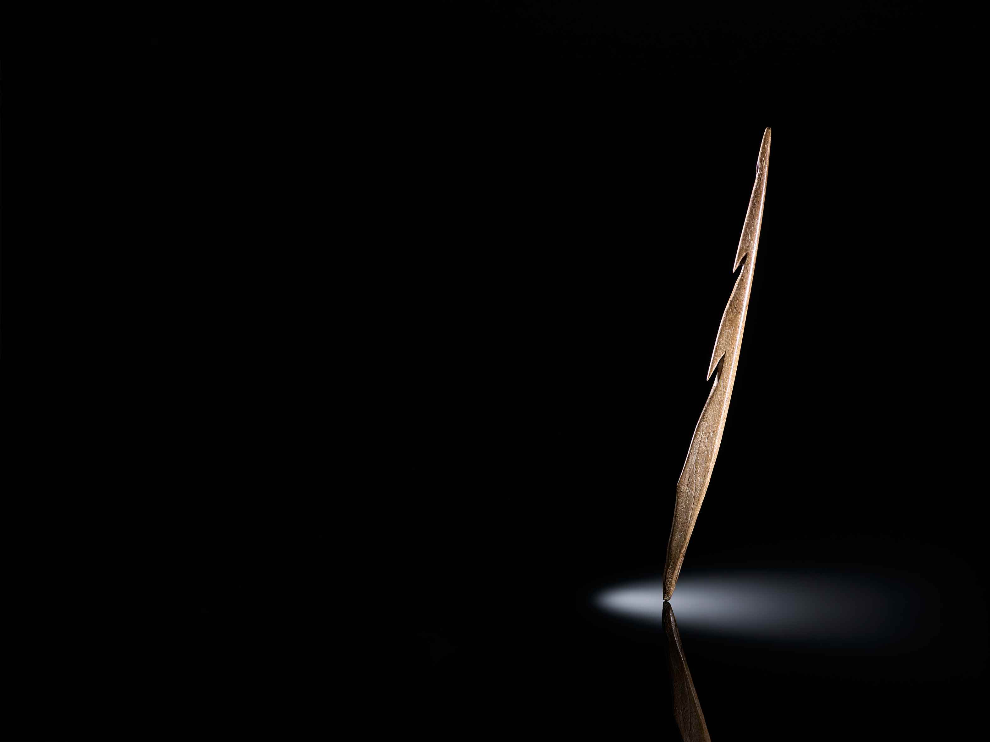 Fischspeer, Widerhakenspitze mit Resten eines Schäftungsklebstoffes (Elch-?) Knochen, Bienenwachs, Holzkohle 11.050 v. Chr. (C14-Datierung), Spätpaläolithikum Fundort: Seseke bei Bergkamen – Oberaden H max. 0,9cm B max. 1,6cm L 25,3cm Inv. Nr. 4182, © Stefan Brentführer, LWL Archäologie für Westfalen