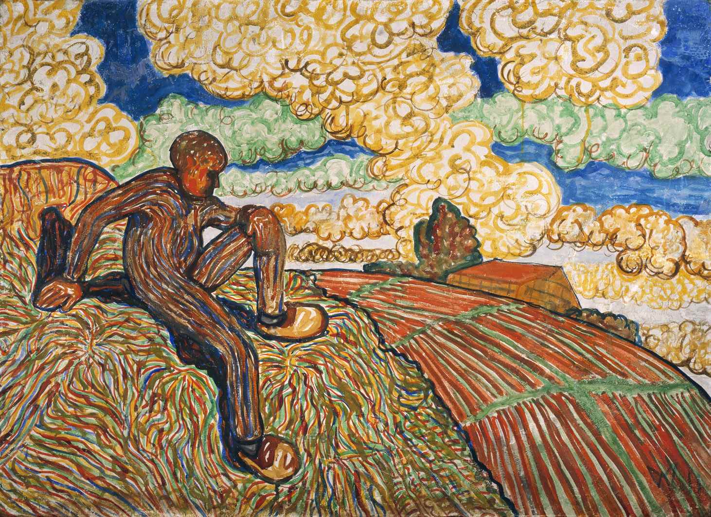 Wilhelm Morgner ((1891-1917), Der Mann auf dem Hügel, 1911, Leimtempera auf Graupappe 85 x 117 cm, © Heinz Feußner, Hamm